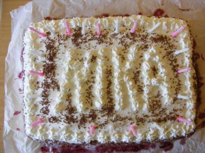 Er ist leider viereckig, weil wir kein Backblech haben. Deshalb mussten wir auf unsere Auflaufform ausweichen... aber das eine Schwarzwälder Kirschtorte normalerweise rund ist, weiß Nika ja nicht hihi...